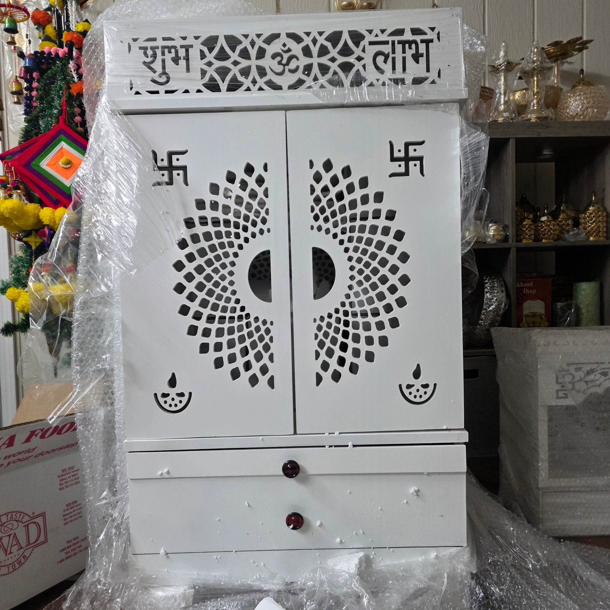 A magnificent and large wooden temple (Mandir) designed to be the centerpiece of your home. Crafted in a crisp white finish, this Mandir features intricate laser-cut carvings, including the sacred 'Om' symbol and 'Shubh Labh' (Auspicious Profit) for prosperity. It offers two beautiful peacock-patterned doors and two spacious lower drawers for storing puja essentials.